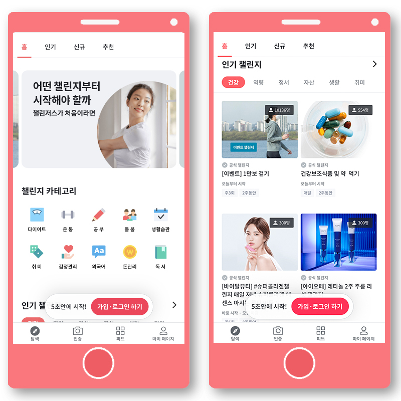 인생을 바꾸는 건 결심보다 행동! 전 국민 목표 달성 프로젝트, 챌린저스 어떻게 하면 목표를 더 잘 달성할까 챌린저스는 2012년부터 8년간 자기계발 커뮤니티 Being & Doing을 운영한 노하우에서 시작되었습니다. 4천여개의 목표를 관리하면서 목표달성에 가장 필요한 것은 의지보다 반드시 해내야만 하는 환경이라는 결론을 얻었고, 스스로 돈을 걸고 실천해 나가는 목표달성 플랫폼 챌린저스 를 만들게 되었습니다. 01 지키고 싶은 나와의 약속을 고르세요 아침기상, 운동, 책읽기, 취미연습까지 나에게 필요한 작은 미션을 선택하세요. 평...