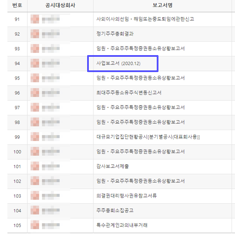 기업을 검색을 해보시면 많은 보고서들이 게시되어 있을 텐데요! 우리가 주목해서 봐야 할 것은 사업보고서입니다!