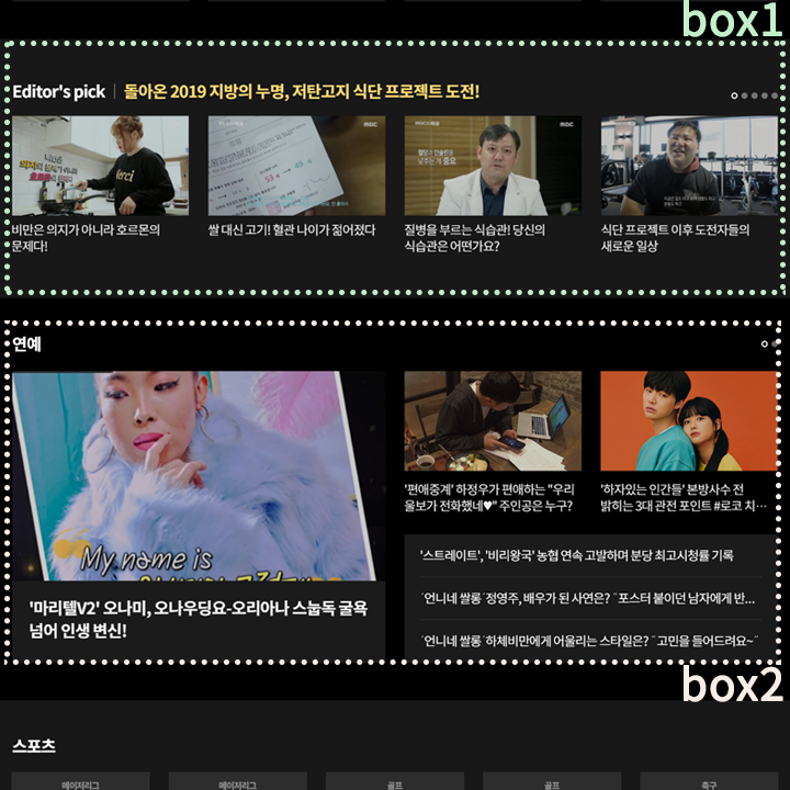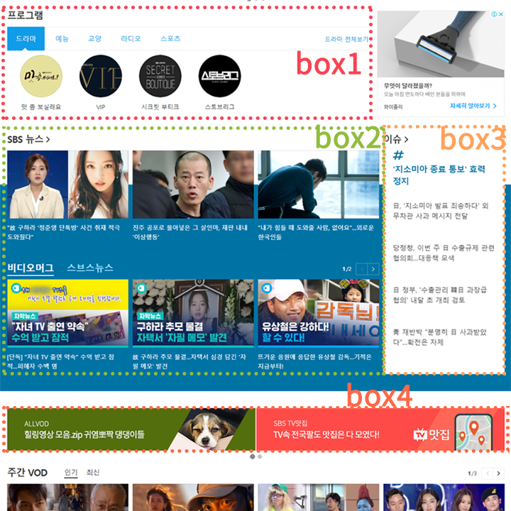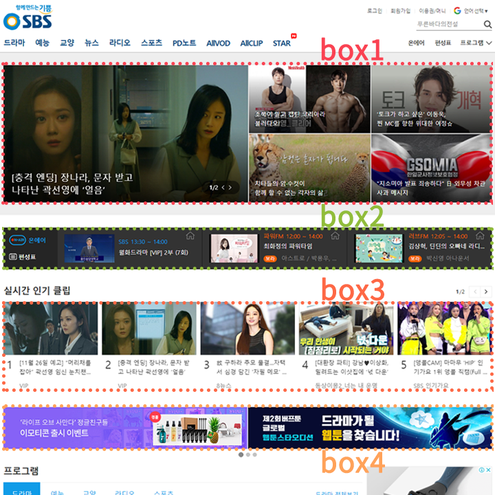 가장 먼저 눈에 들어오는 영역인 box1은 프로그램의 다양한 채널광고를 보여주고,