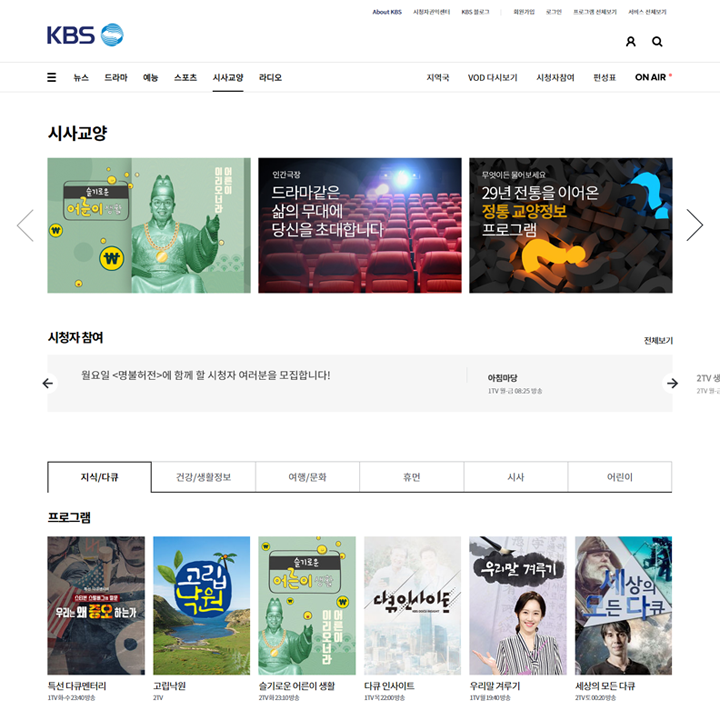 '시사교양'을 상단에 넣어 kbs가 어떤점을 포인트로 하고 있는지 알 수 있어요.