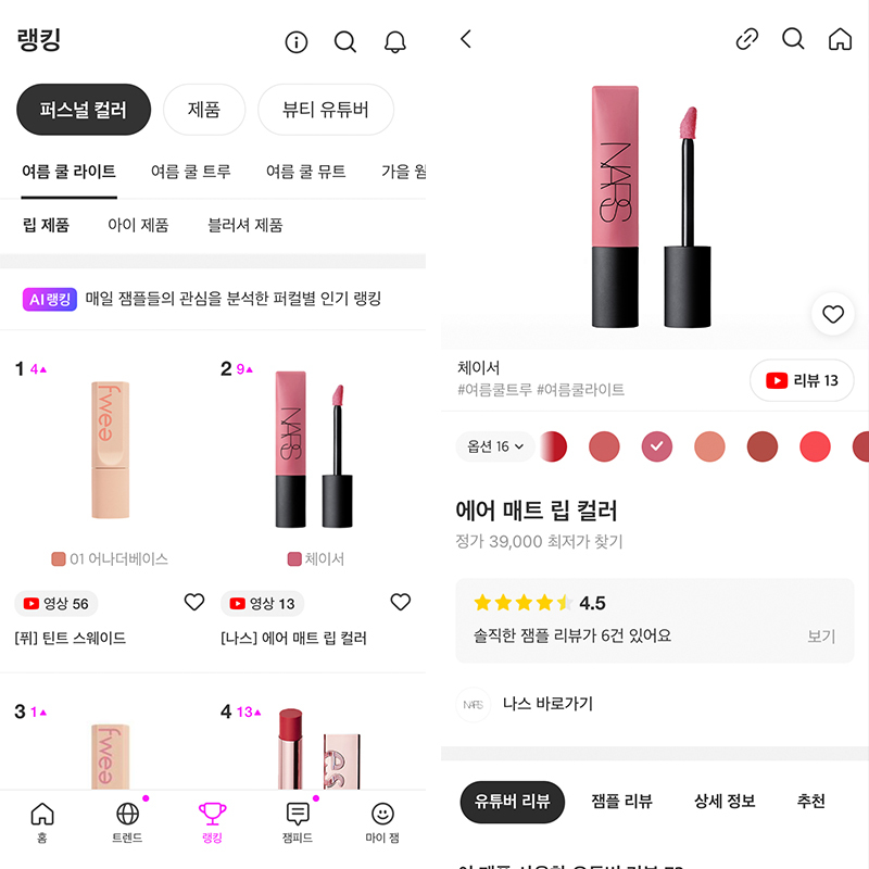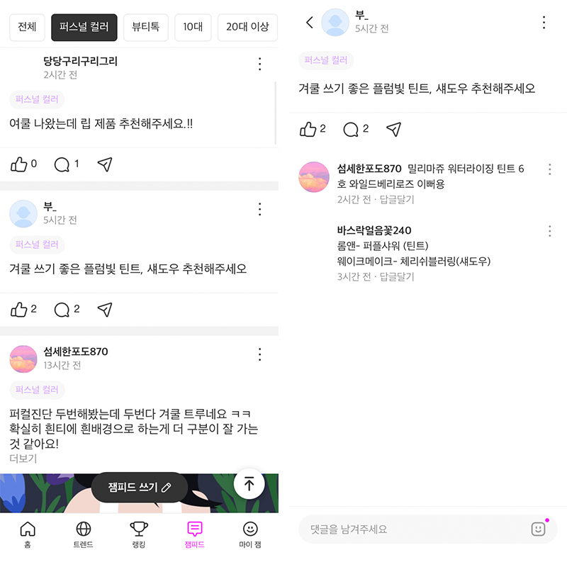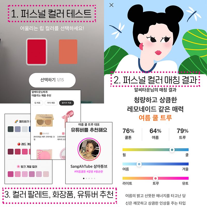 저에게 맞는 컬러, 화장품, 유튜버를 추천받을 수 있습니다.