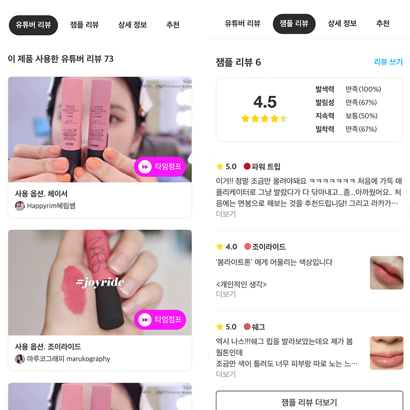 다만 원하는 제품에 관련된 뷰티 유튜버 영상이 한데 모여있어서