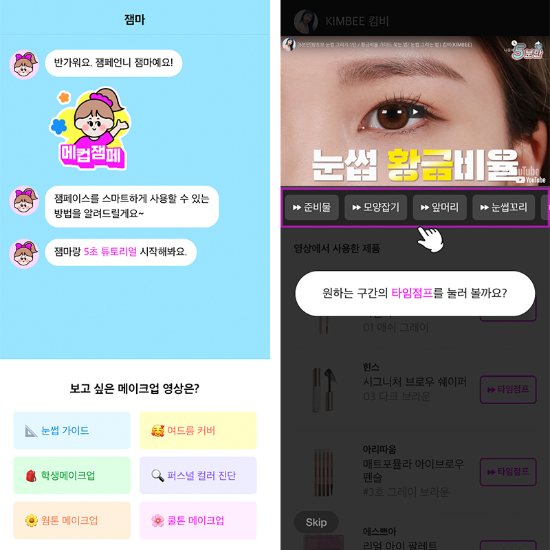 타임점프 영상리뷰 관심태그 페이스매칭 뷰티클래스 뷰티영상, 타임점프 로 스마트하게 뷰티 유튜버 영상 이제 스마트하게 보세요! 영상에 사용한 화장품 1초만에 확인하고, 내가 원하는 구간만 골라 보고! 잼페이스와 함께 글로벌 크리에이터로 성장하세요! 국내 크리에이터와 MCN이 글로벌 시장에서 활약할 수 있도록 잼페이스가 함께 할게요! 크리에이터 페이지 바로가기 함께 만드는 잼페이스 잼페이스는 모두가 나만의 스타일을 찾고 행복해지는 세상을 꿈꿉니다. 잼페이스에 궁금한 점이 있다면 무엇이든 문의주세요. 더 좋은 서비스로 보답할게요.