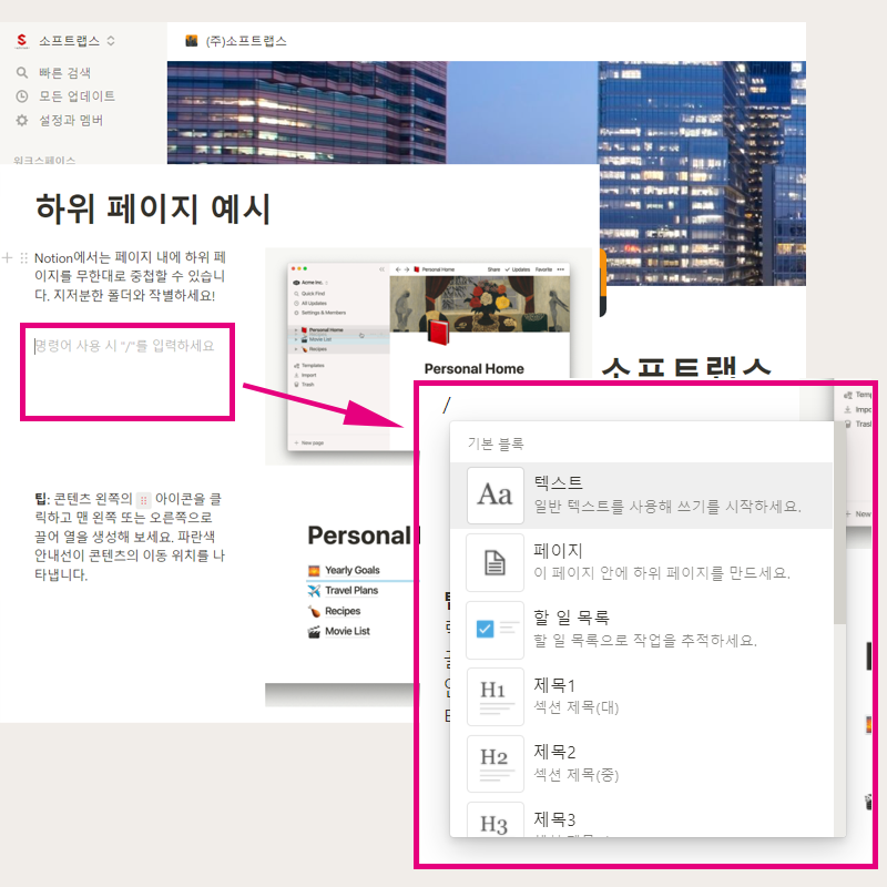 노션은 일단 필기앱들과는 다르게 블록단위로 데이터를 저장할 수 있는데요.