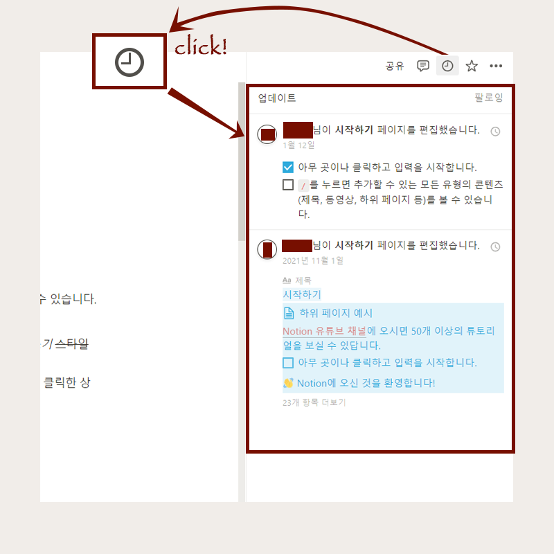 노션은 블록 단위로 페이지 히스토리를 볼 수 있습니다!! 날짜와 시간대별로 구분도 해주고, 과거의 데이터를 복구