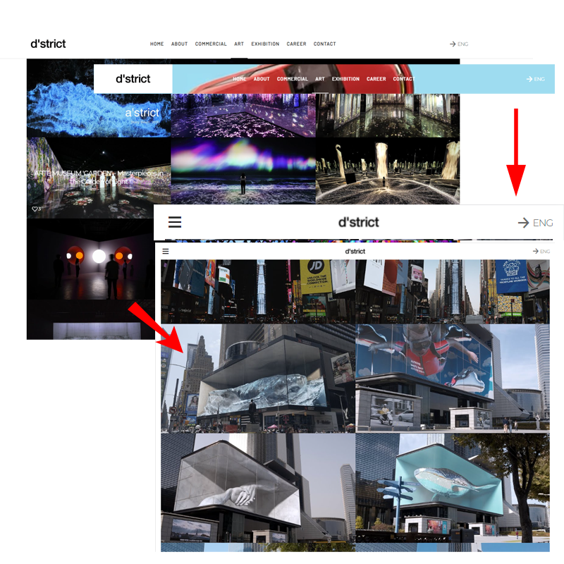 디스트릭트 웹사이트는 반응형 처리가 되어있어 width값을 줄이면 레이아웃이 변경됩니다.