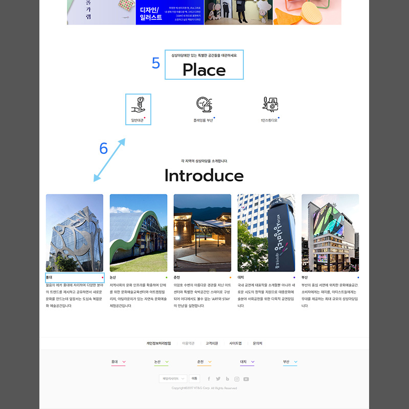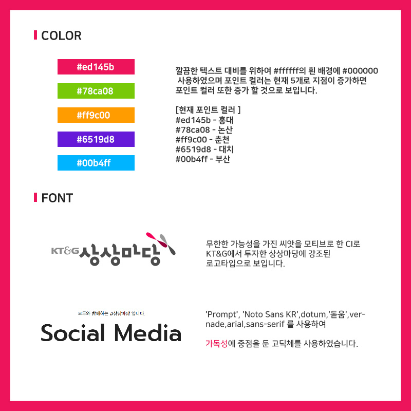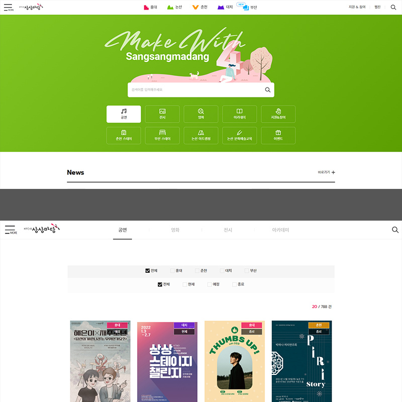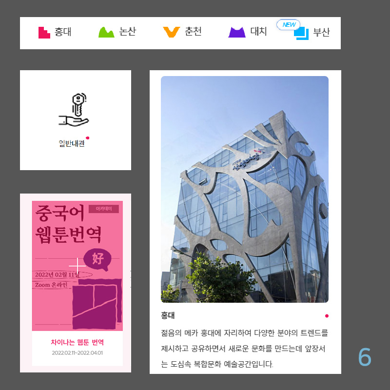 상상마당 페이지의 큰 특징은 '지점의 고유의 색상과 마크를 사용'한다는 점입니다.