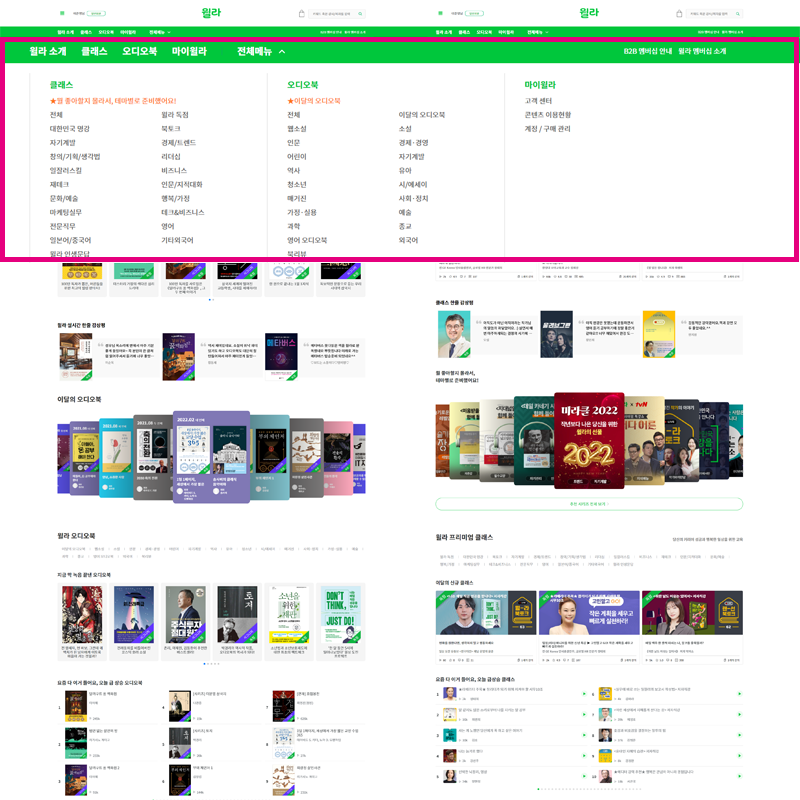 오디오북 메뉴페이지입니다. 위에 말씀드린 데로 전체 메뉴를 상세보기할 수 있어요!!!