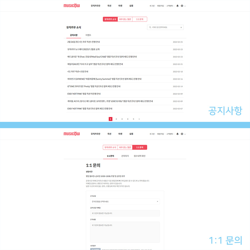 공지사항과 1:1 문의와의 차이에서 통일성이 조금 부족하게 느껴집니다.
