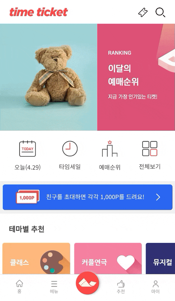 추천 메뉴의 경우 처음 봤을 때 유저들이 추천한 공연 연극 클래스 등을 순위로 보여주는 거라고 생각했습니다.