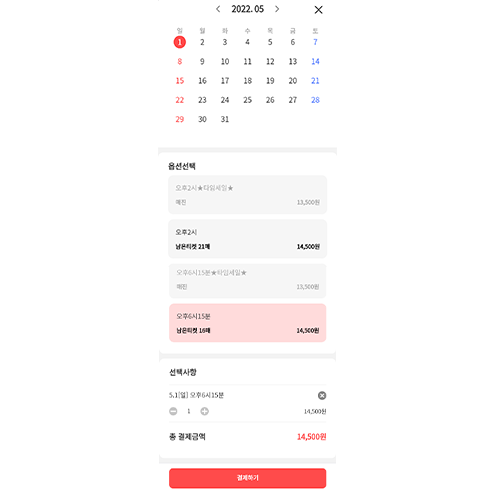 티켓을 선택하면 날짜와 요일 시간을 보여주고 몇 장을 구매할 건지 선택할 수 있는 창과 결제하기 버튼이 나옵니다.