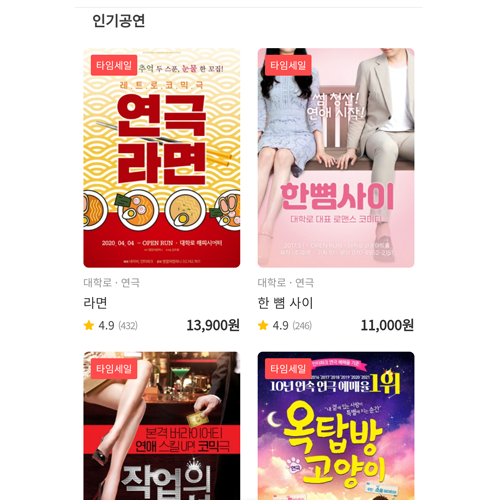 인기 공연 부분은 한 줄에 2개씩 화면을 보여주며 화면을 아래로 스크롤 해가며 보는 형태입니다.