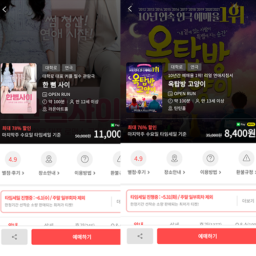 예매 같은 경우 내용이 많고 복잡해 보일 수 있는데 이런 구성은 깔끔하고 정렬되어 보여 복잡해 보이지 않는 느낌을 줄 수 있습니다.