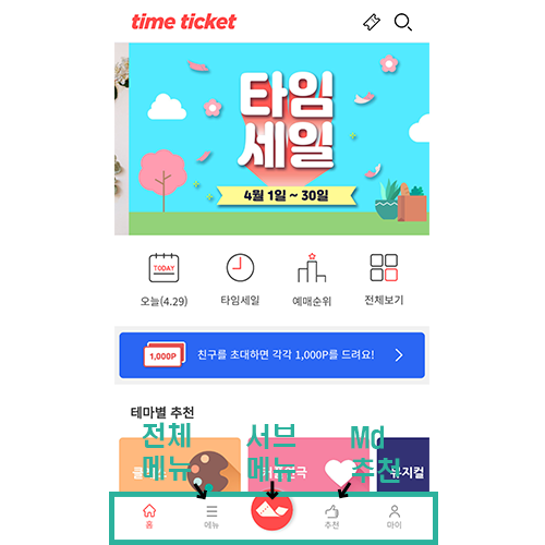 홈, 전 메뉴, 서브 메뉴, Md 추천 메뉴, 마이페이지 이렇게 구성되어 있습니다.