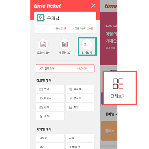 메인의 전체 보기 아이콘을 눌렀을 때와 하단 서브 메뉴의 연극. 뮤지컬 버튼을 눌렀을 때 같은 화면이 출력됩니다.