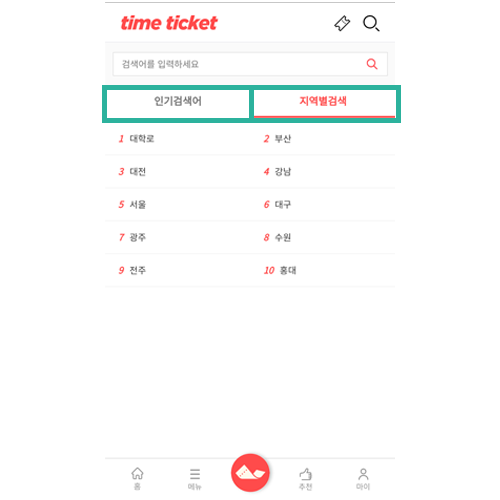 중단은 2뎁스로 인기 검색과 지역별 검색이 나오네요. 각 뎁스를 눌렀을 때 선택한 부분을 알 수 있게 색이 변하는 애니메이션이 들어갔습니다.