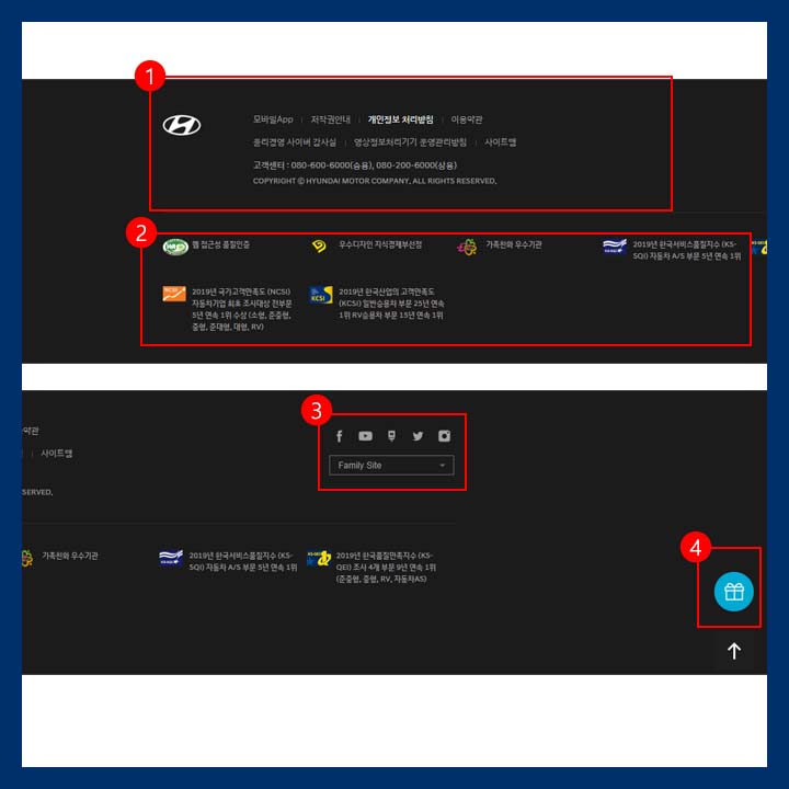 현대자동차의 푸터영역은 여느 타 사이트들과 비슷하게