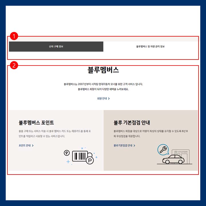 신차구매정보와 블루멤버스 차량관리 정보 버튼을 만들어