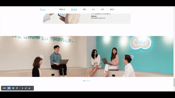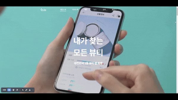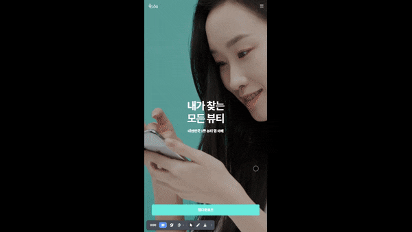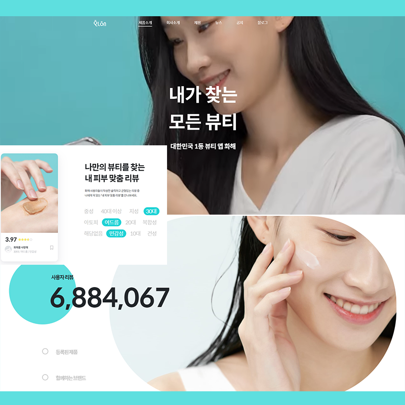 일단 메인 화면부터 보시면 밝은 민트색 컬러에 아름다운 모델분들이 화장품 시연을 하는 동영상이 풀사이즈 배경으로 채워주고 있습니다.
