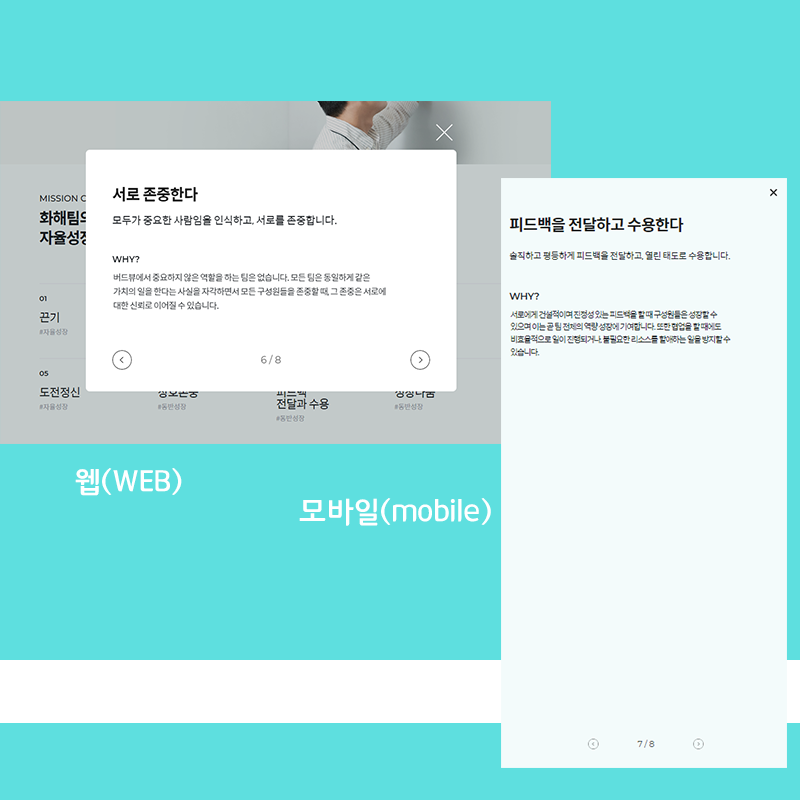 화해라는 회사의 비전이나 목표, 그리고 가치관을 볼 수 있는 페이지입니다.