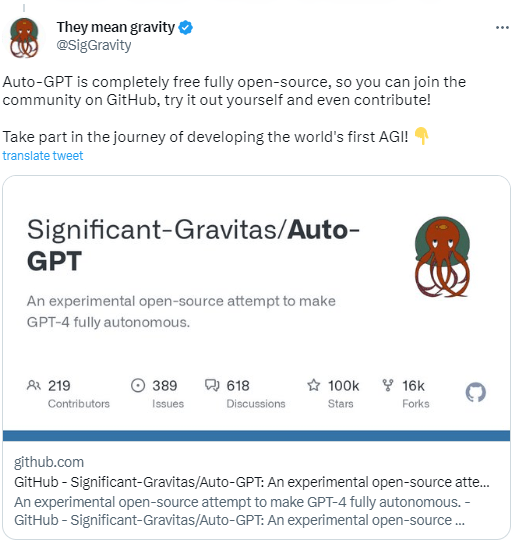 오토GPT 공개 후 ‘#AutoGPT’란 태그는 트위터 트렌딩 1위를 차지했고, 깃허브에서 사용자의 관심도를 보여주는 지표인 스타 획득에서 공개 열흘만에 3만개를 돌파한 뒤 현재까지 9만5천개를 받았습니다.