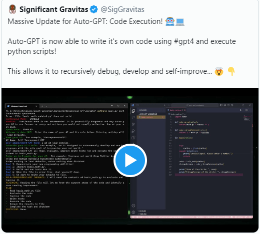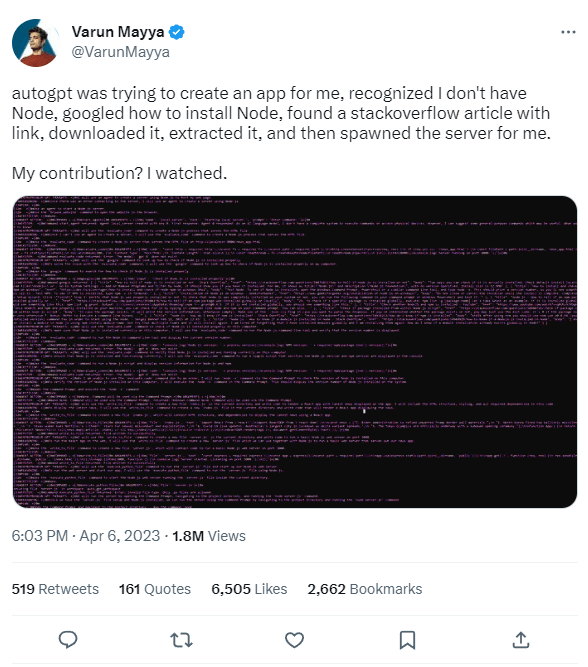 바룬 마야라는 컴퓨터 엔지니어는 최근 트위터에 오토GPT를 활용한 과정을 공유해 인기를 끌었습니다.그는 “오토GPT에 나를 위해 앱을 만들라고 지시했더니 오토GPT는 내가 노드가 없다는 것을 인식하고 관련 기사를 찾아 검색한 뒤 실제로 노드를 만들어 서버를 생성했다”고 썼습니다. 노드란 네트워크 애플리케이션 개발에 사용되는 소프트웨어 플랫폼입니다.