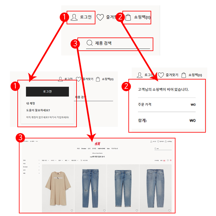 로그인,즐겨찾기,쇼핑백 버튼이 위치되있는데요