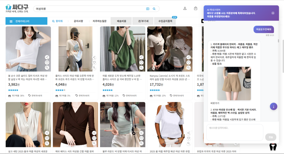 싸다구의 UI는 이커머스에 익숙한 사용자에게도 진입장벽이 낮게 설계되어 있습니다. 전체적인 플로우는 국내 쇼핑몰과 유사하며, 특히 AI 기능이 UI 내에 자연스럽게 통합되어 있어 별도 학습 없이 사용할 수 있습니다.