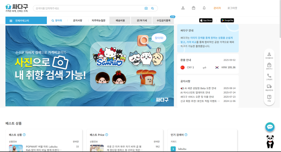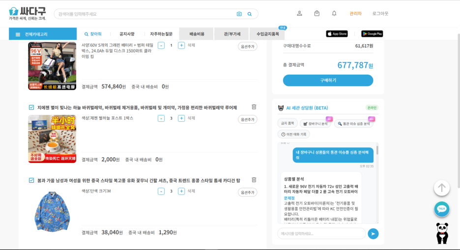 싸다구는 기본적인 구매대행 절차를 자동화하면서도, AI 기반 기능을 적극적으로 도입하여 사용자의 탐색과 구매 편의를 높였습니다. 특히 AI 상품 추천과 AI 세관 상담 (BETA) 기능은 다른 구매대행 사이트에서는 보기 힘든 기술적 강점입니다.