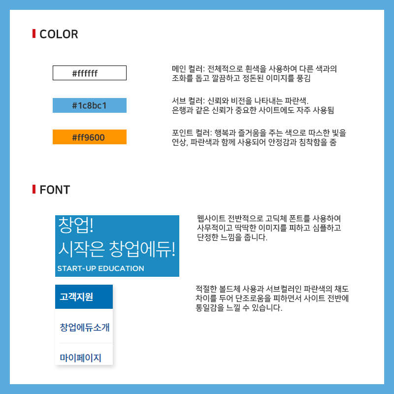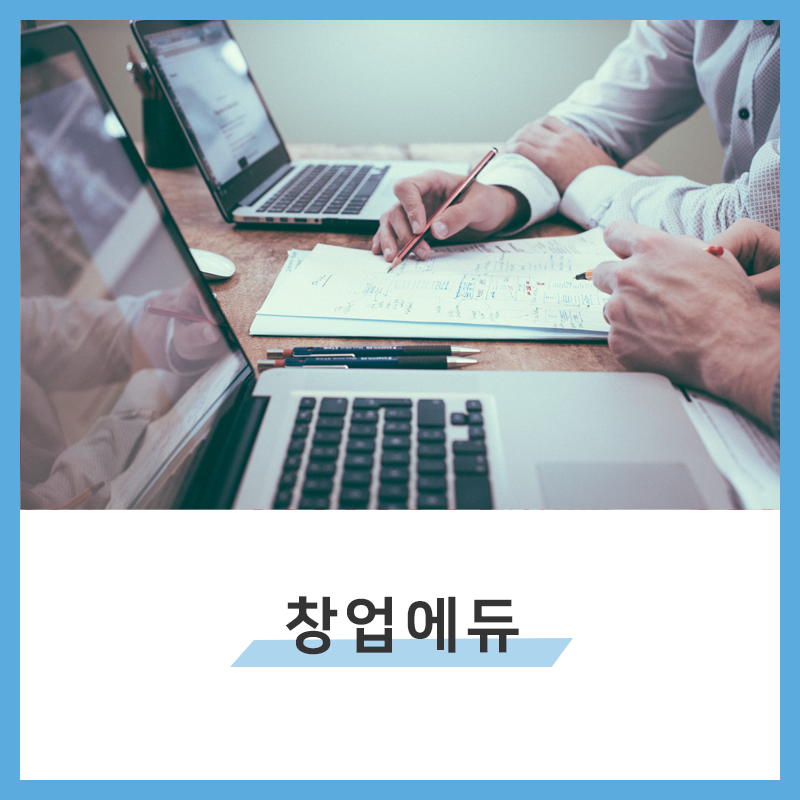 '창업! 시작은 창업에듀!'라는 문구와 함께 회사의 아이덴티티를 한 눈에 잘 표현했네요.