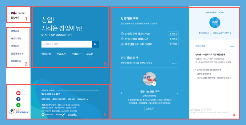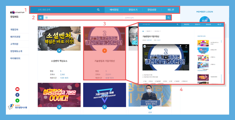 창업에 도움을 주는 각 분야별 강좌가 분류되어있는 페이지로써
