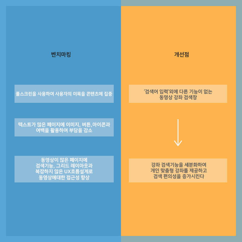 자신에게 맞는 유형의 강좌에 쉽고 빠르게 접근할 수 있도록 하는 것이 중요한 포인트입니다.