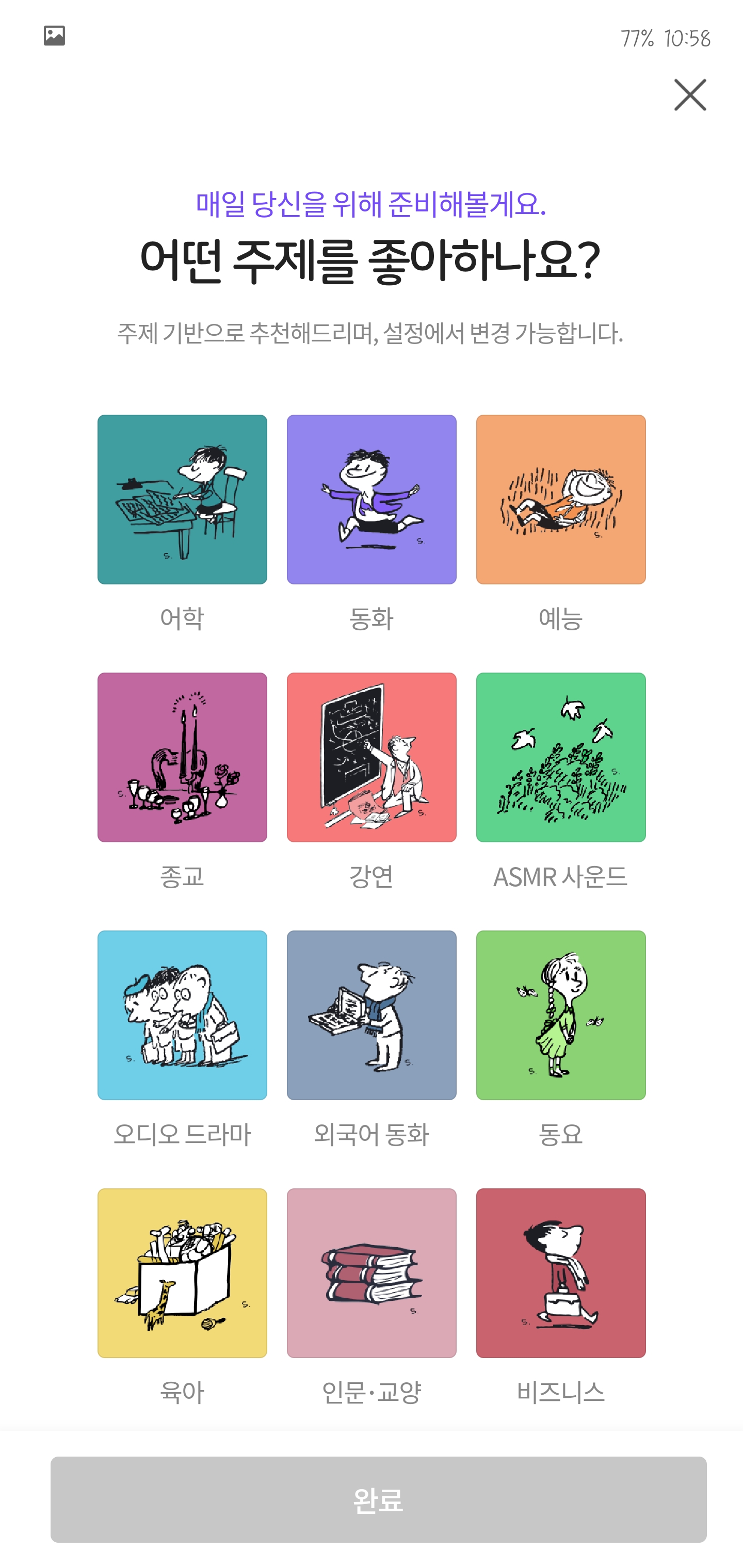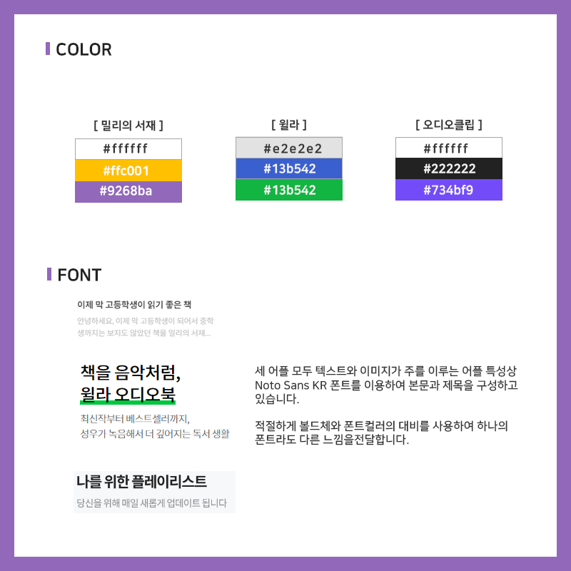 특히, 오디오클립은 책 카테고리별로 다른 컬러를 써서 아기자기하고