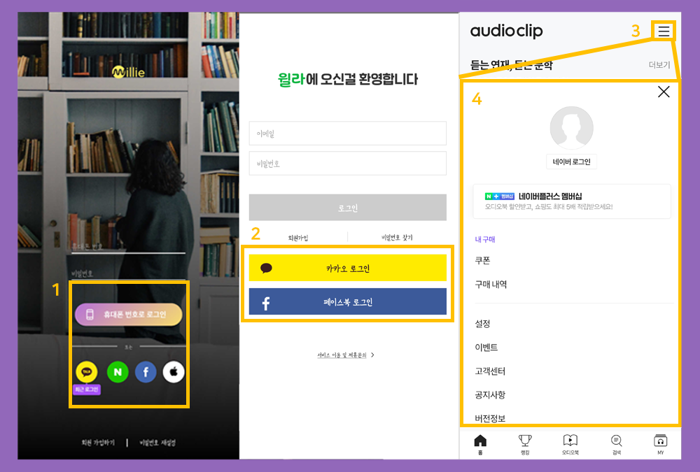 네이버에서 만든 어플인만큼 오디오클립은 현재 네이버 계정으로만 로그인이 가능합니다.