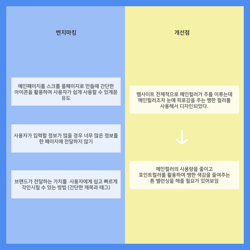 콘텐츠는 모두 상단 이미지처럼 가운데에 정렬되어 있고 이후에 나올 페이지들도 노란색 영역에서 나타납니다.