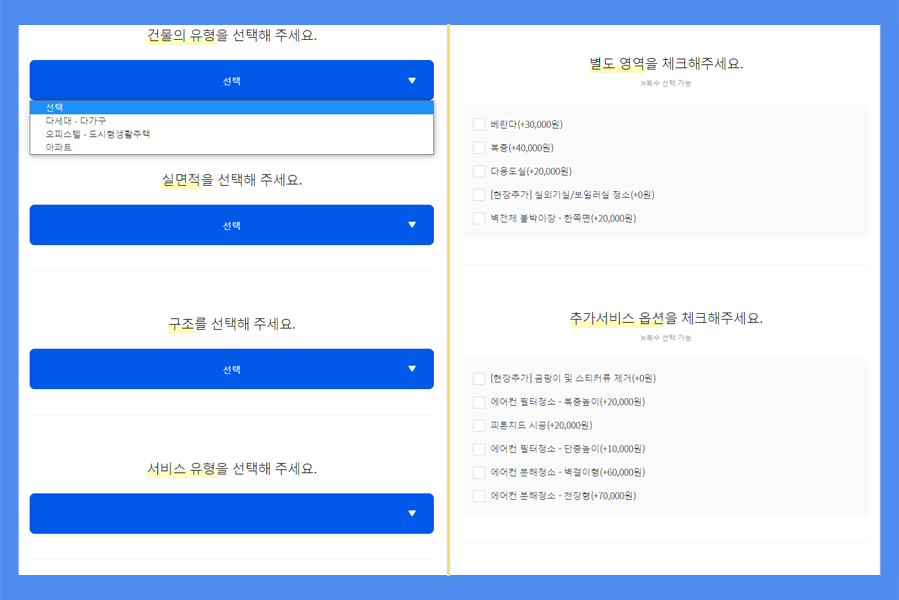 건물의 유형, 실면적, 구조, 서비스 유형을 선택하도록 되어 있습니다.