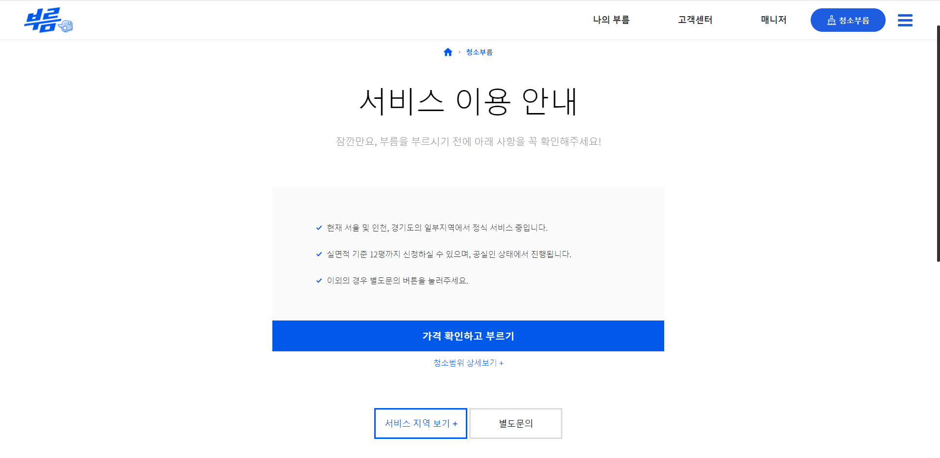 먼저 '청소부름' 버튼을 클릭할 시 제일 먼저 뜨는 화면입니다.