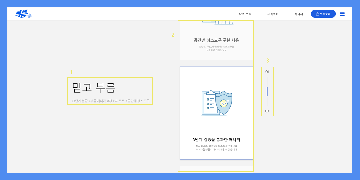 부름 홈페이지는 기본적으로 스크롤 풀페이지 디자인입니다.