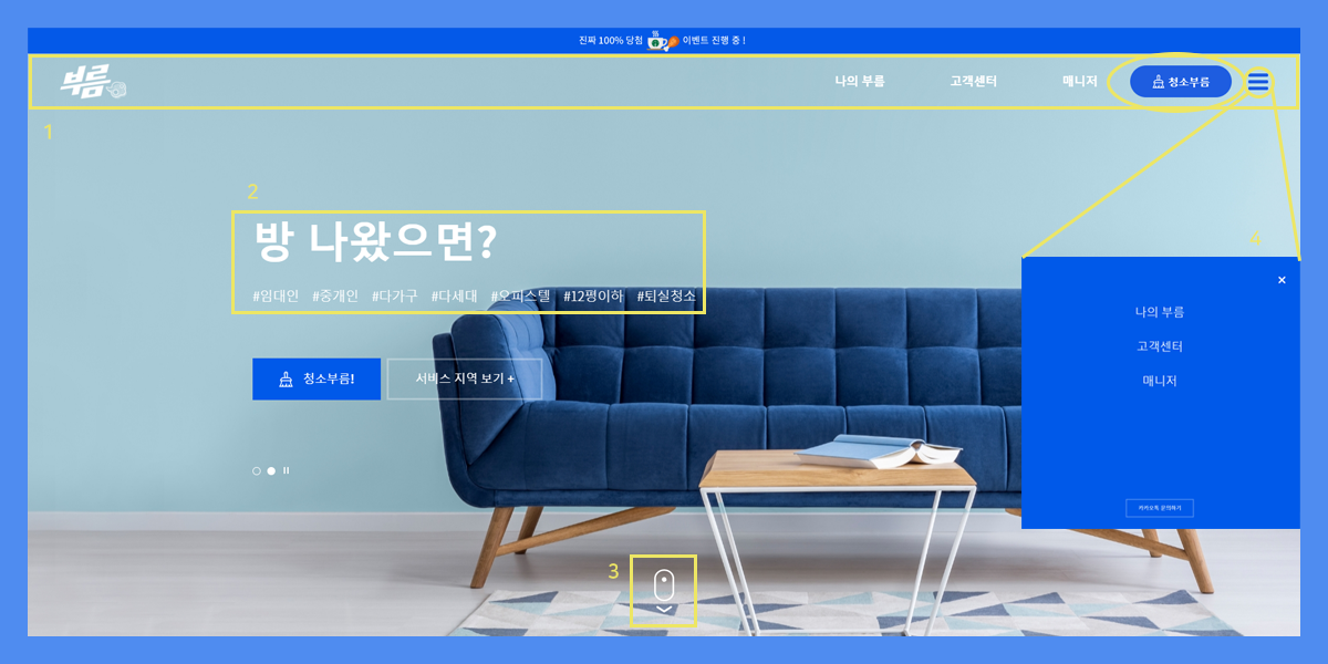 부름 홈페이지는 기본적으로 스크롤 풀페이지 디자인입니다.