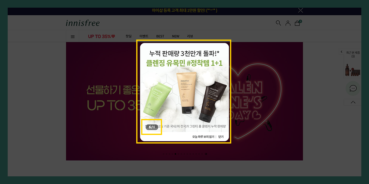하지만 이니스프리 홈페이지의 경우 팝업창을 동일한 크기로 맞춰 한 곳에 모아