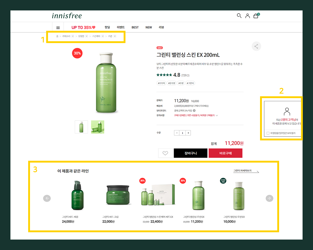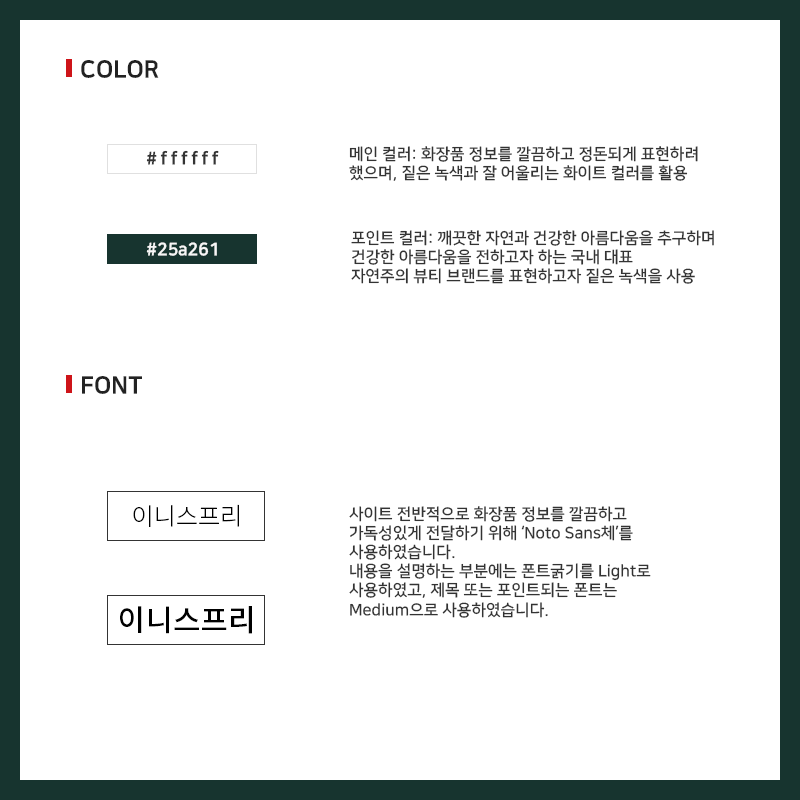 이니스프리의 대표적인 포인트컬러인 짙은 녹색을 좀 더 활용하면