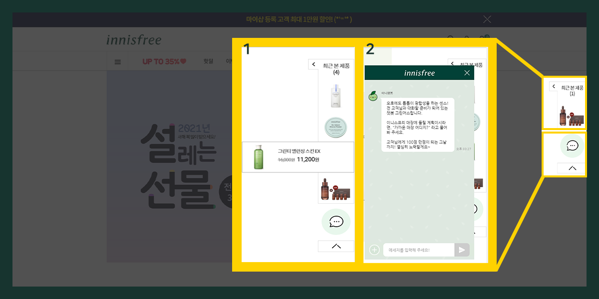 또한 말풍선 아이콘은 이니스프리 챗봇으로