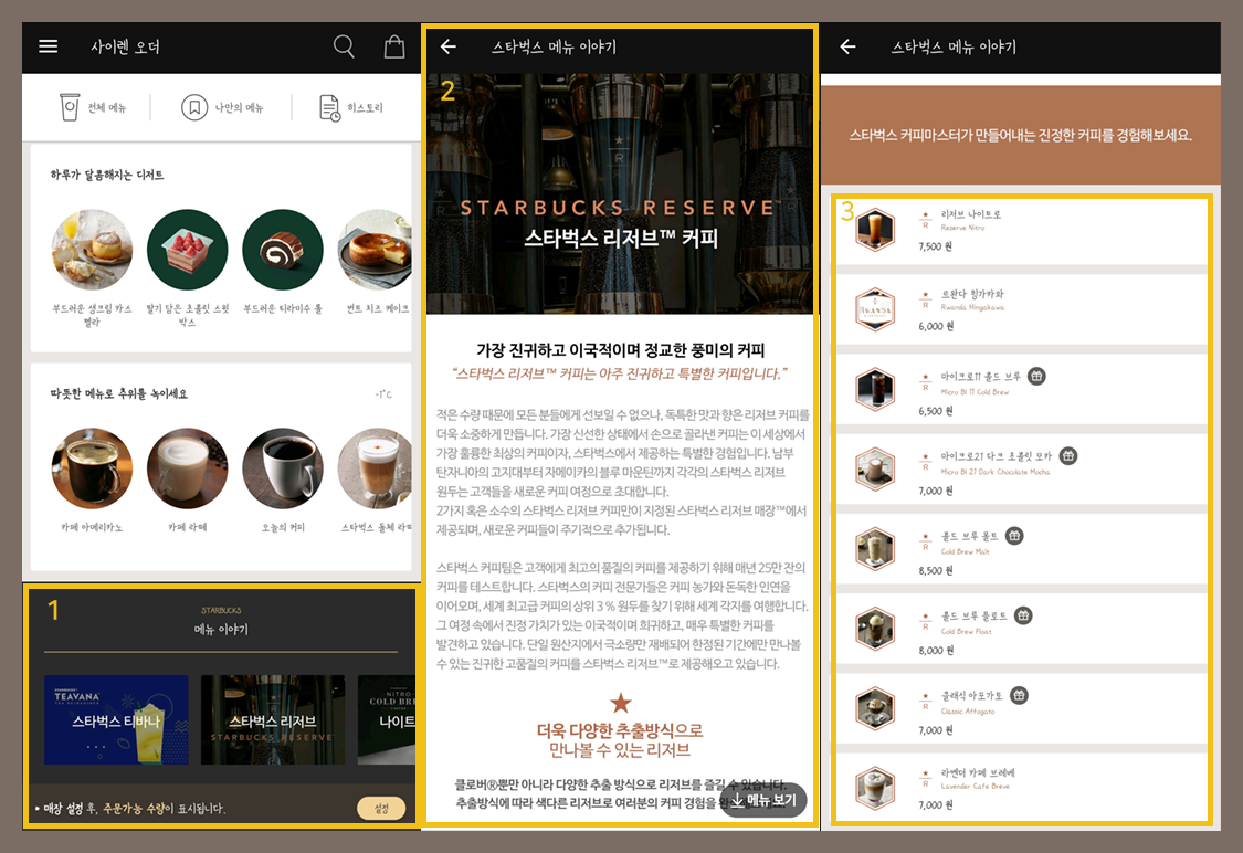 스타벅스의 철학을 엿볼 수 있는 탭 메뉴 구성인 것 같습니다.
