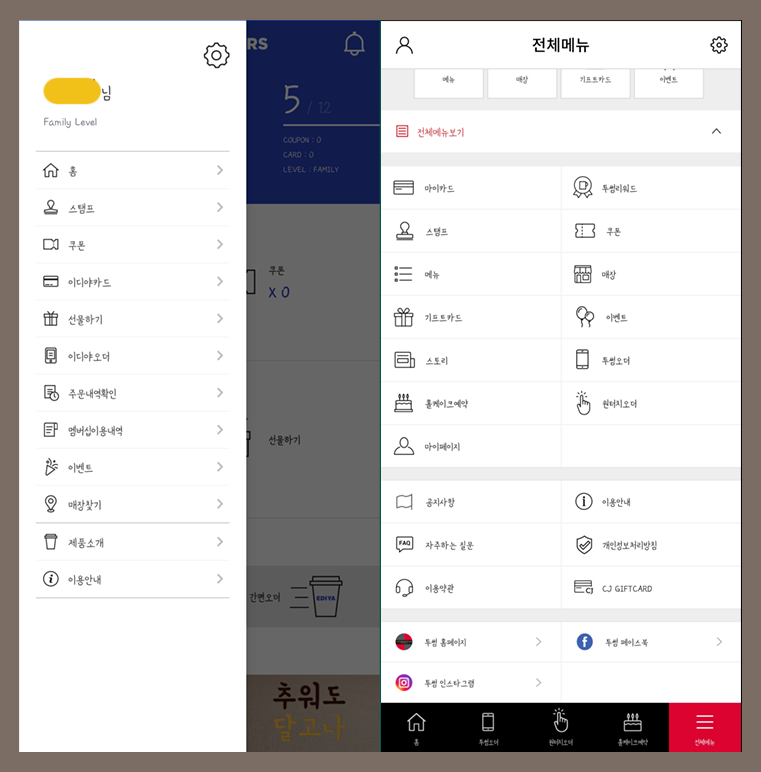 다른 카페 어플들의 메뉴구성은 어떤지 간단하게 살펴볼까요??