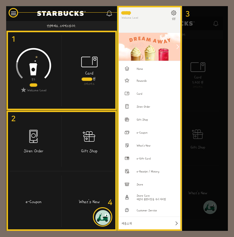 네가지의 스타벅스 주요 서비스가 나와있는 영역입니다.