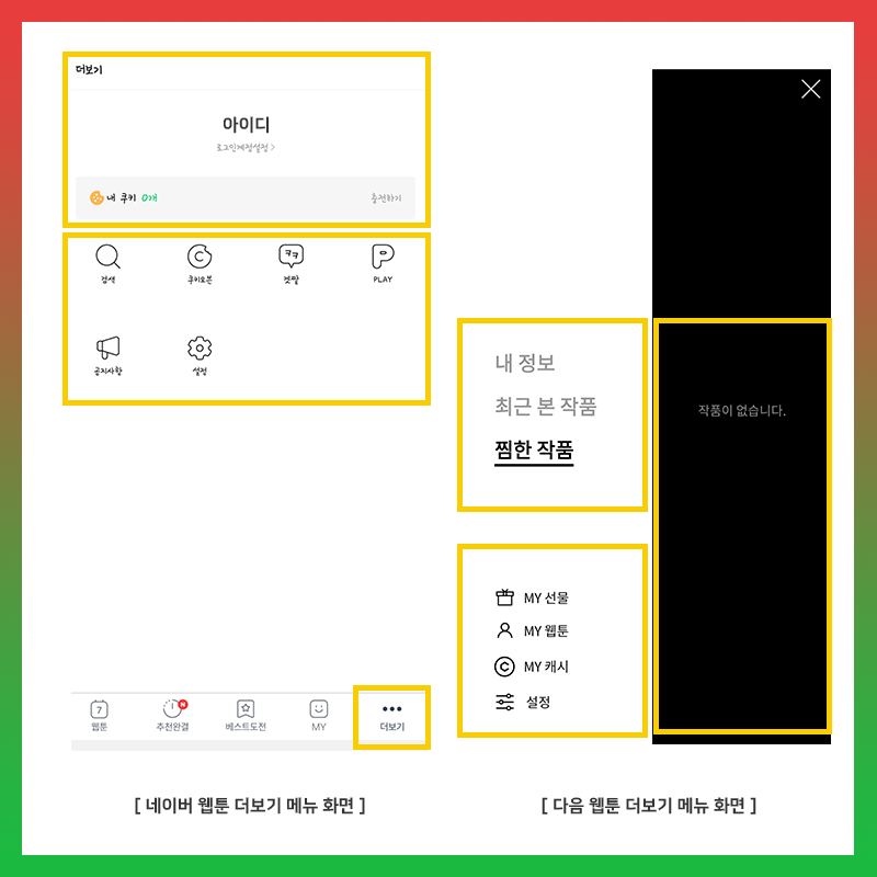 반면, 다음웹툰의 경우 햄버거 메뉴안에 찜한 작품, 최근 본 작품, 내 정보를 모아 놓았습니다.