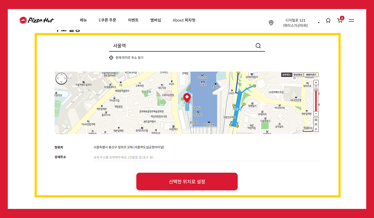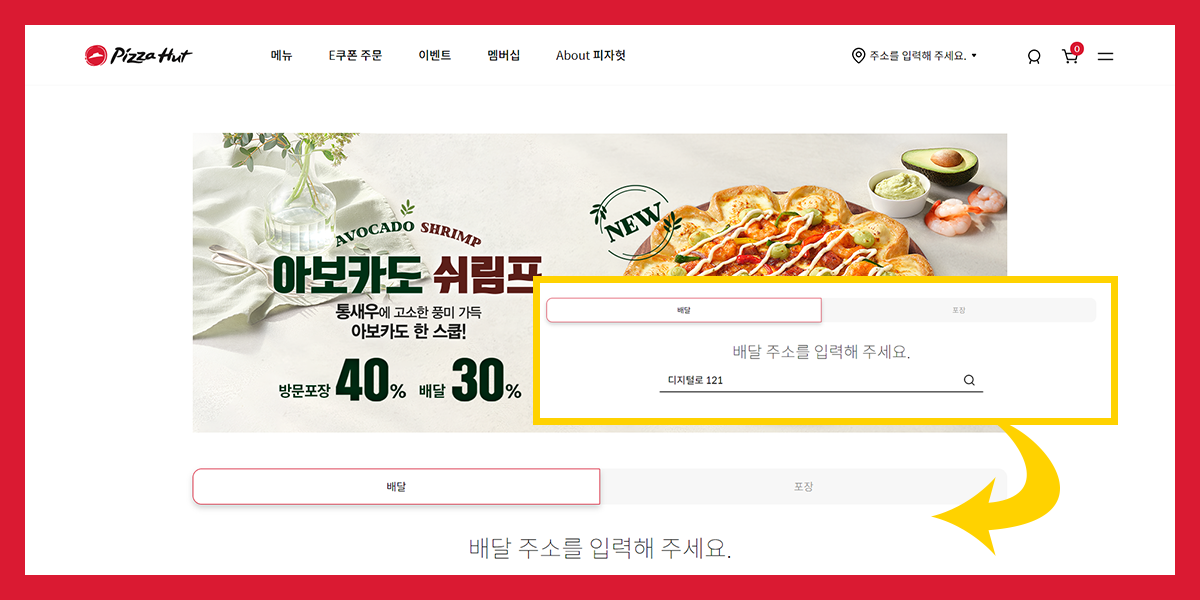 상단 피자헛 로고를 눌러도 이전의 배달/포장 주소 입력창이 나타나는 것이 아니라