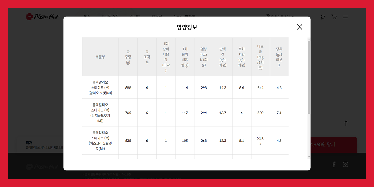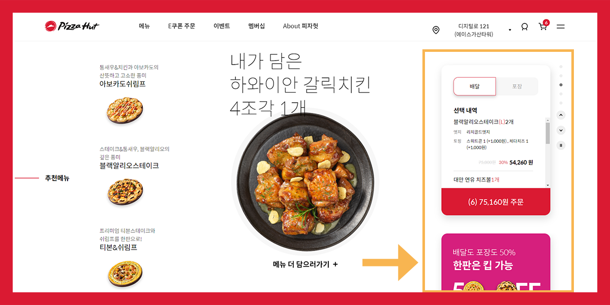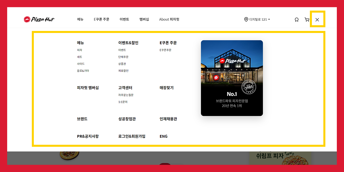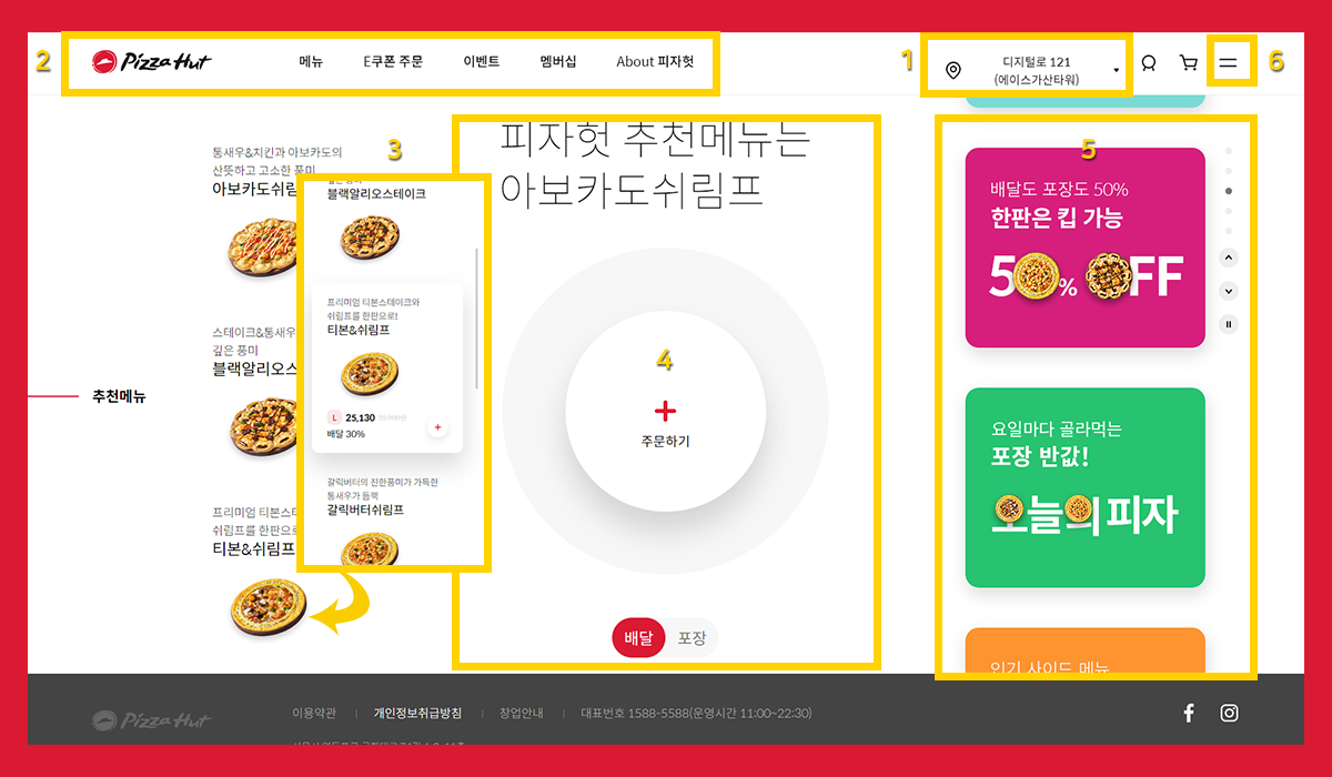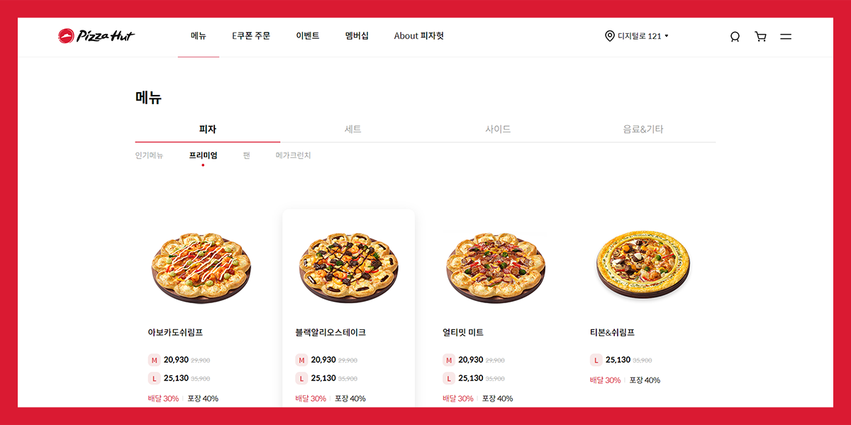 왼쪽에는 피자헛 로고를 통해 서브 페이지에 있더라도 메인 페이지로 빠르게 이동할 수 있습니다.