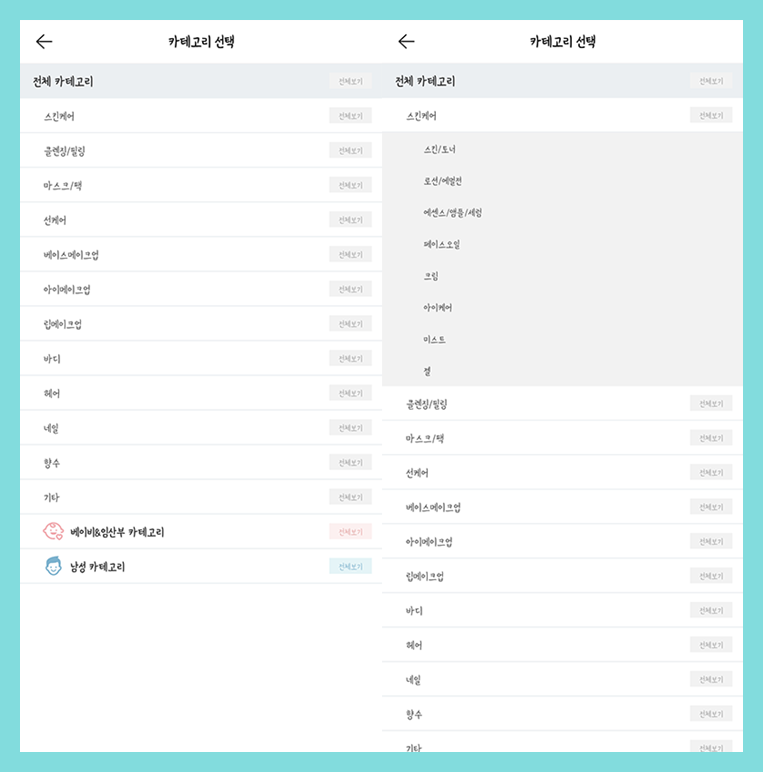 오른쪽화면은 각 카테고리를 클릭했을 때 나오는 세부 카테고리입니다.