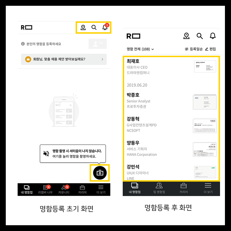 사용자가 자신의 명함 또는 받은 명함을 촬영해 올리면